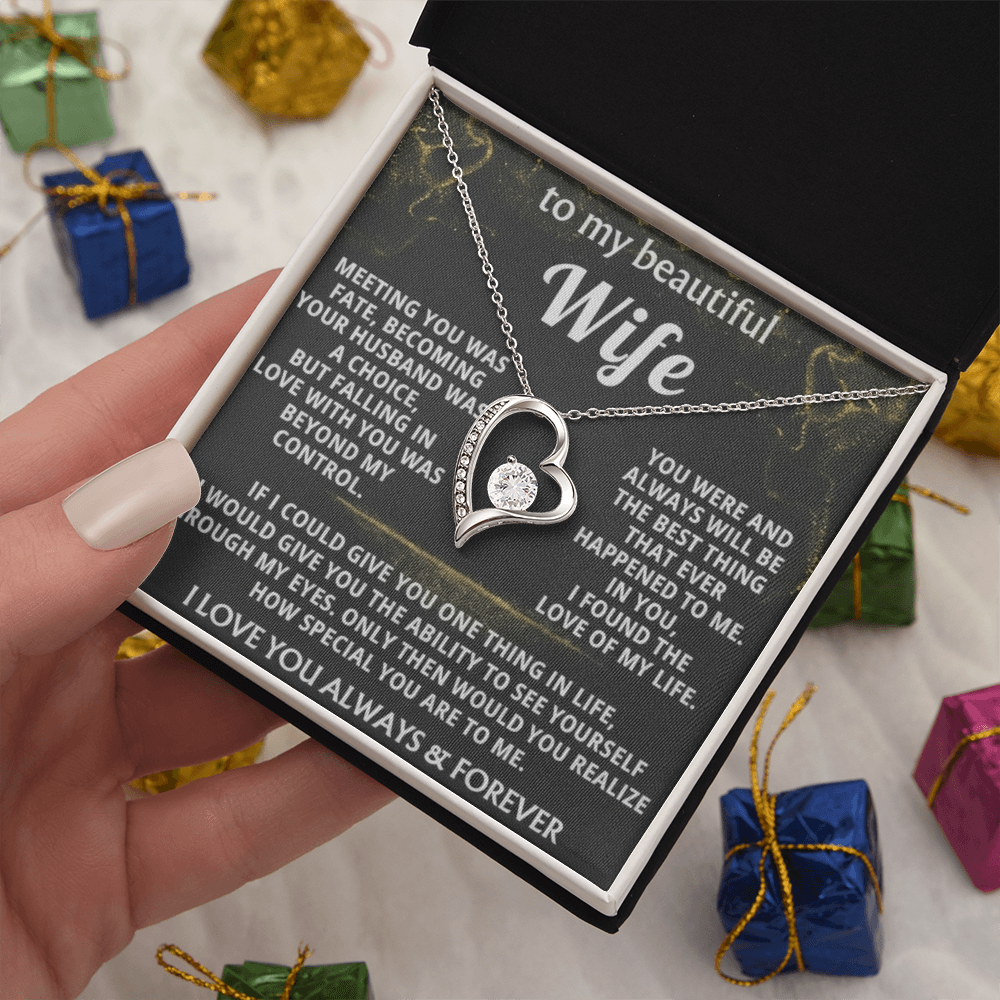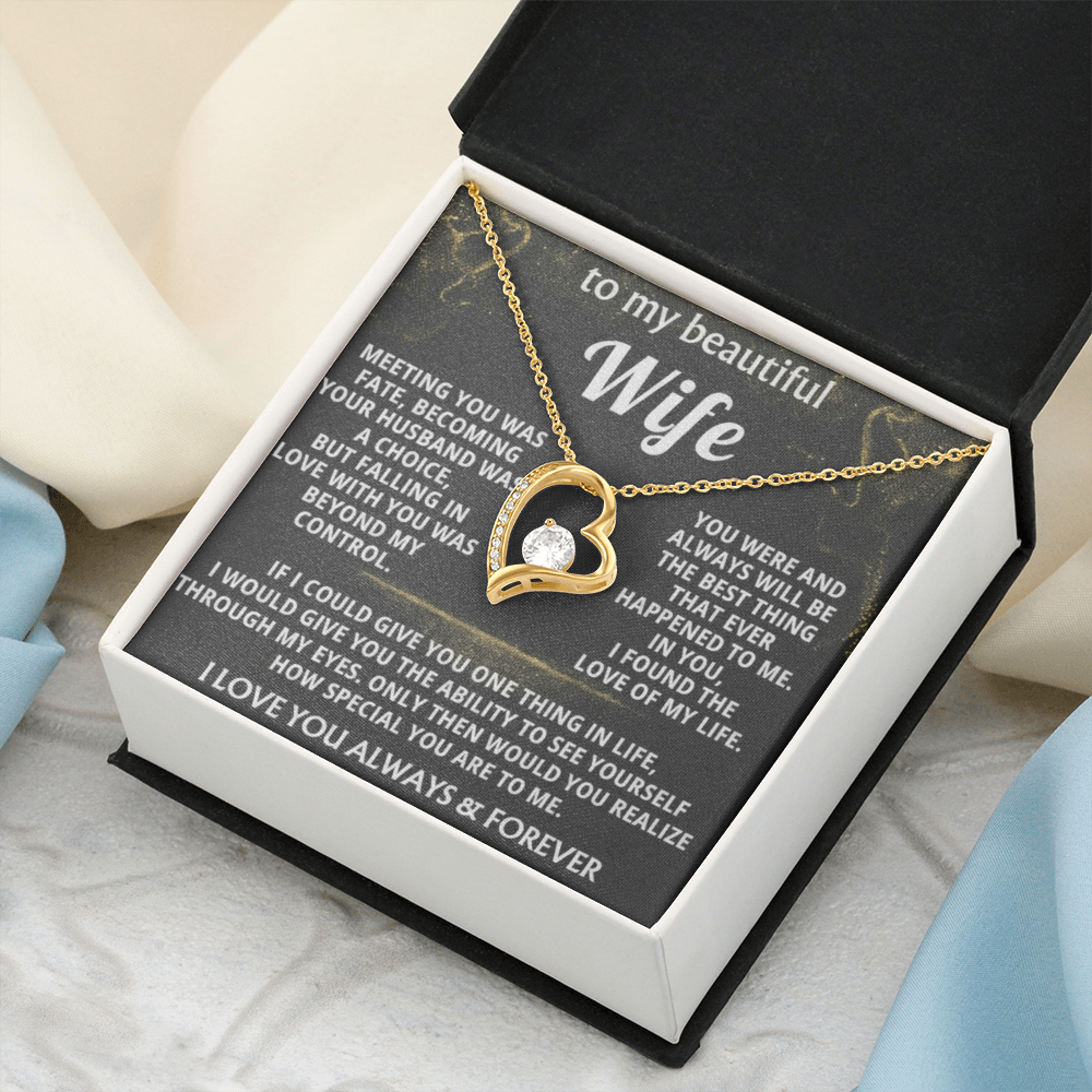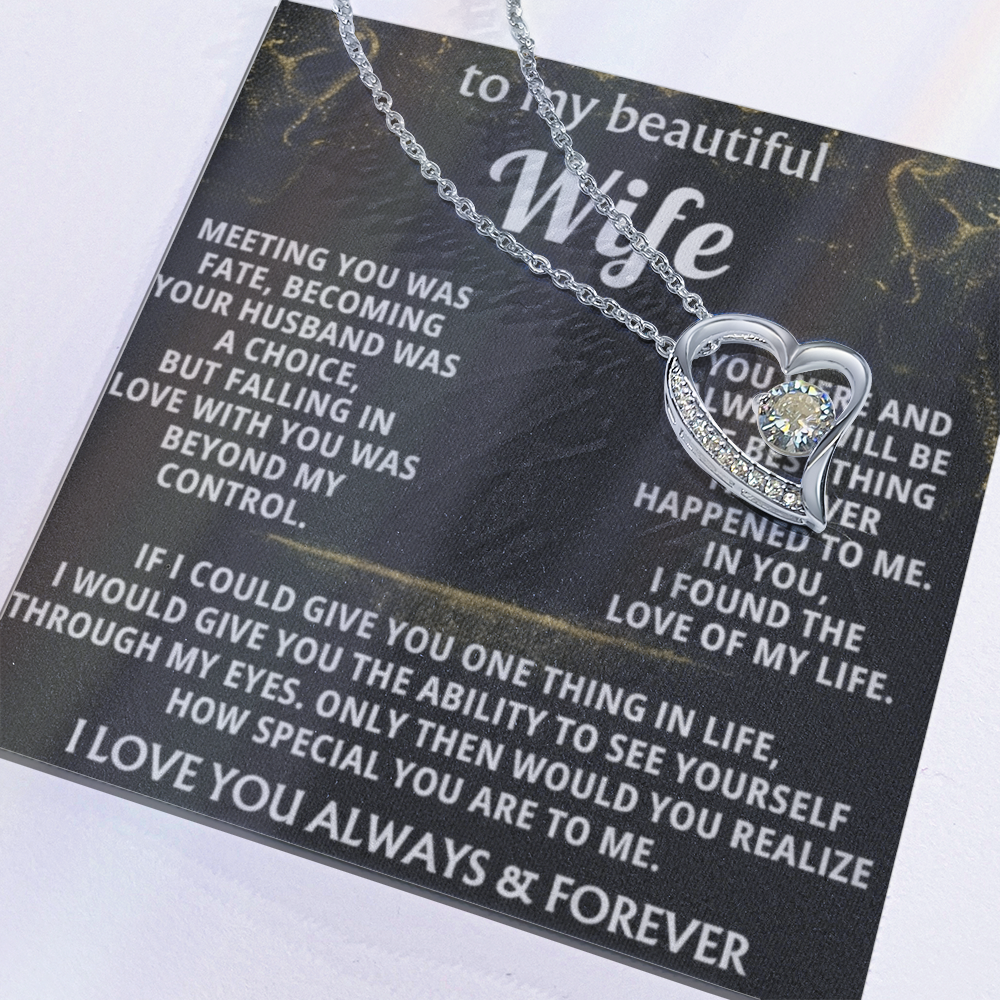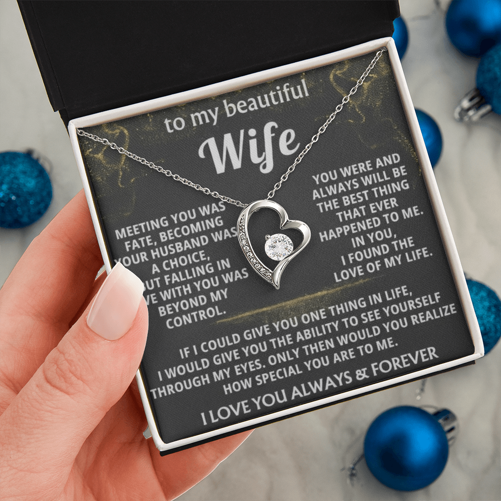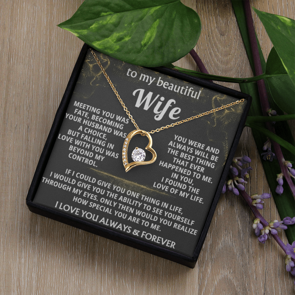 Quote On Message Card: TO MY BEAUTIFUL WIFE , Meeting you was fate, becoming your husband was a choice, but falling in love with you was beyond my control. You were and always will be the best thing that ever happened to me. In you, I found the love of my life. If I could give you one thing in life, I would give you the ability to see yourself through my eyes. Only then would you realize how special you are to me. I LOVE YOU ALWAYS & FOREVER